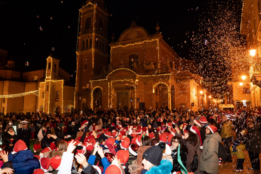 Dopo una fiaccolata lungo le vie del centro le luci vengono accese alla presenza del Cardinale Zuppi e sotto una pioggia di bolle di sapone…